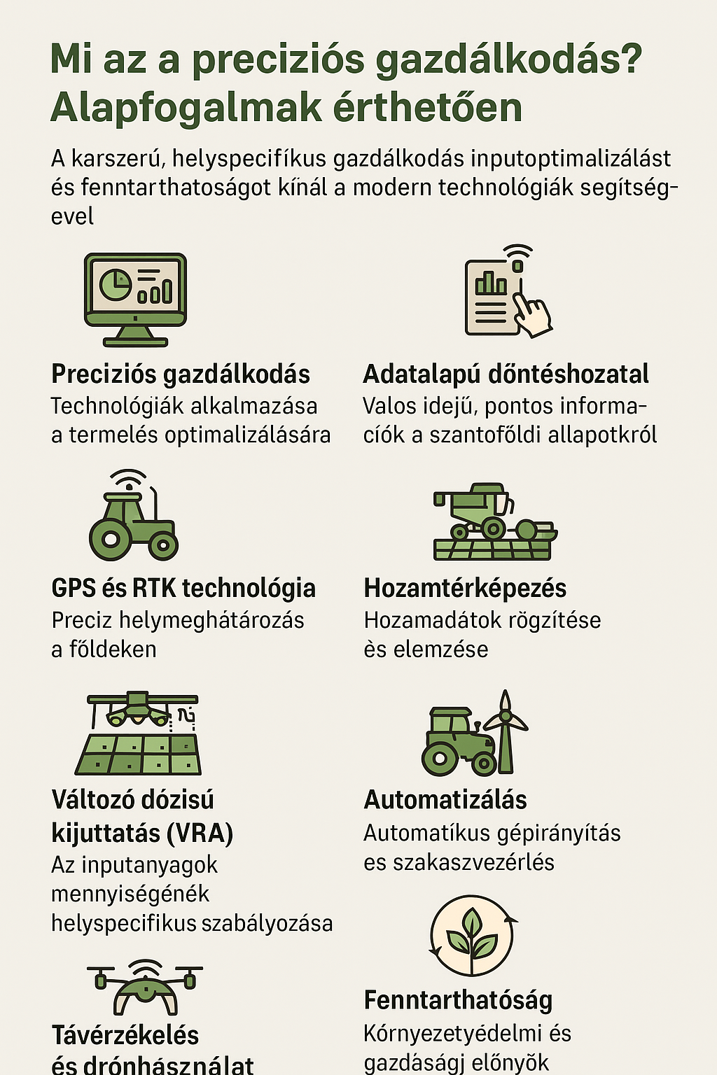 A precíziós gazdálkodás egy korszerű, fenntartható és gazdaságilag is megtérülő irányzat, amely az adatalapú döntéshozatalra, a helyspecifikus kezelésekre és a modern technológiák integrálására épül. Az alapfogalmak ismerete elengedhetetlen ahhoz, hogy a gazdák sikeresen bevezessék ezt a rendszert saját gazdaságaikban.